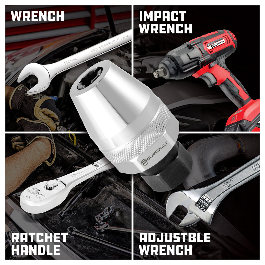 Removing engine block studs can be one of the most frustrating steps in engine servicing. Studs breaking, stripped threads, or being solidly stuck are unfortunately common problems. Powerbuilt has the cure. The Powerbuilt 3/8 Inch Drive Stud Extractor extracts clean, rusted, broken, or stripped engine block or chassis studs with ease. The handy stud extractor can be driven with either impact gun, 3/8-inch drive ratchets, bar or wrench so that anyone can use it from a professional to a DIY shade tree mechanic. The universal adjustable 3 jaw design works like a drill chuck with the best results on 1/4-inch to 1/2-inch (6mm – 12mm) studs. The stud extractor’s compact size means you can use it in the engine bay or on the bench. The tool meets or exceeds ANSI standards and has a lifetime warranty.