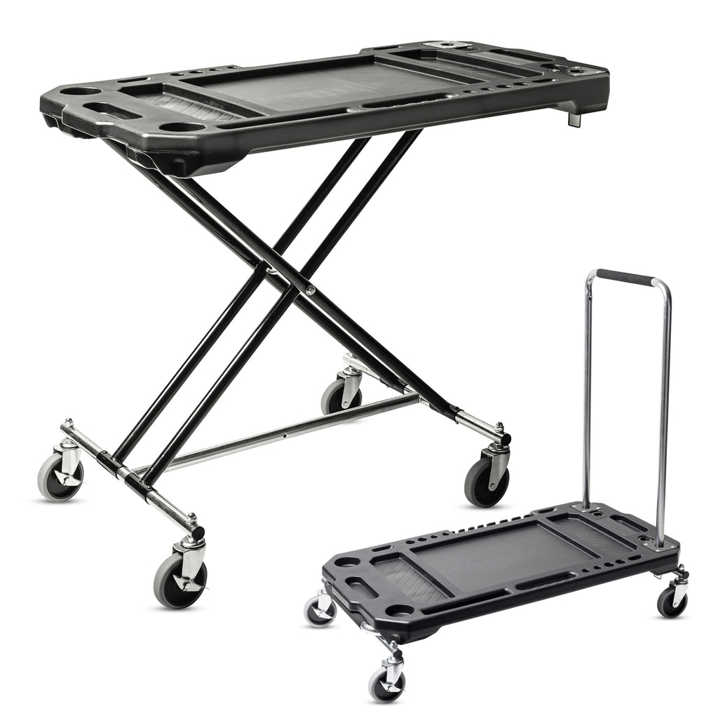 Powerbuilt versatile 3in1 table, dolly, cart, all-in-one multi-functional platform, use it as a mobile workspace to store your needed tools or lower the table to the dolly position for easy transportation of tools or heavy objects. When the table is extended, it provides a spacious work surface with slotted storage areas for your basic tools, cup holders, and other essentials. Lower the folding legs to the bottom dolly position to help move heavy objects on the rolling lockable casters. This multi-height position table extends up to 31 inches high and has a 40.5 inches x 20.5 inches platform. Constructed of heavy-duty blow mold plastic materials and metal legs and handle, the max load weight in the high table position is 180 pounds. In the lowest dolly or cart position, the max load weight is 330 pounds. With its practical design and versatile features, this table/cart is a reliable companion for various tasks, offering both convenience and functionality.