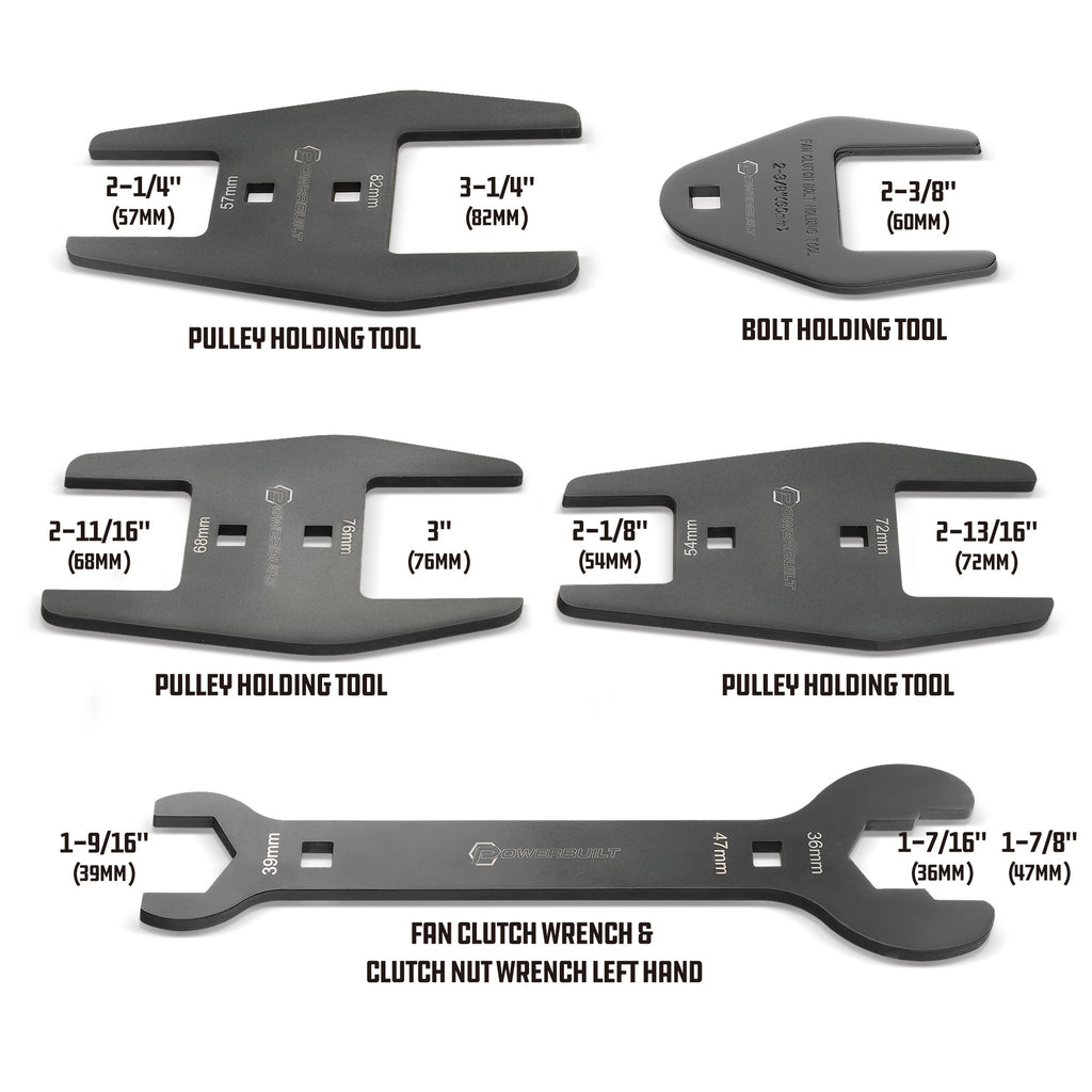 The right tools for the job make a project go smoother and quicker. Servicing a viscous fan clutch is one of those jobs. The Powerbuilt master Fan Clutch Wrench Master Set is designed to remove threaded-on viscous fan clutches on Ford, Chrysler, Jeep, and some imported vehicles with these strong heat-tempered steel fan clutch wrenches. The larger wrench keeps the water pump shaft from spinning while you loosen the fan clutch nut with the appropriate smaller wrench. Wrenches are 1/2 inch square drive, allowing the use of breaker bars and ratchets. The wrenches' black finish is strong and durable for a lifetime of use. The set comes in a sturdy blow-molded hard case with professionally written usage instructions and photos. All Powerbuilt installer kits meet or exceed ANSI standards.