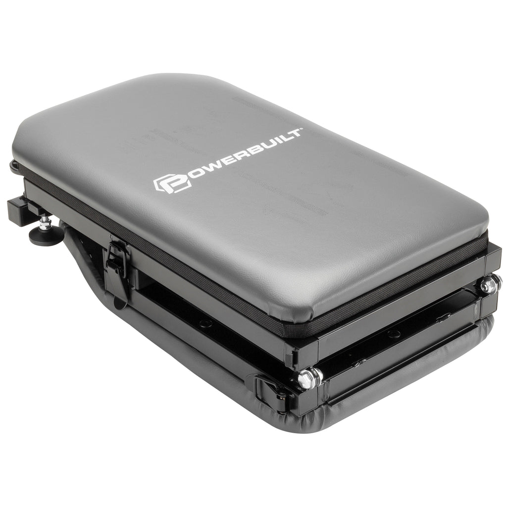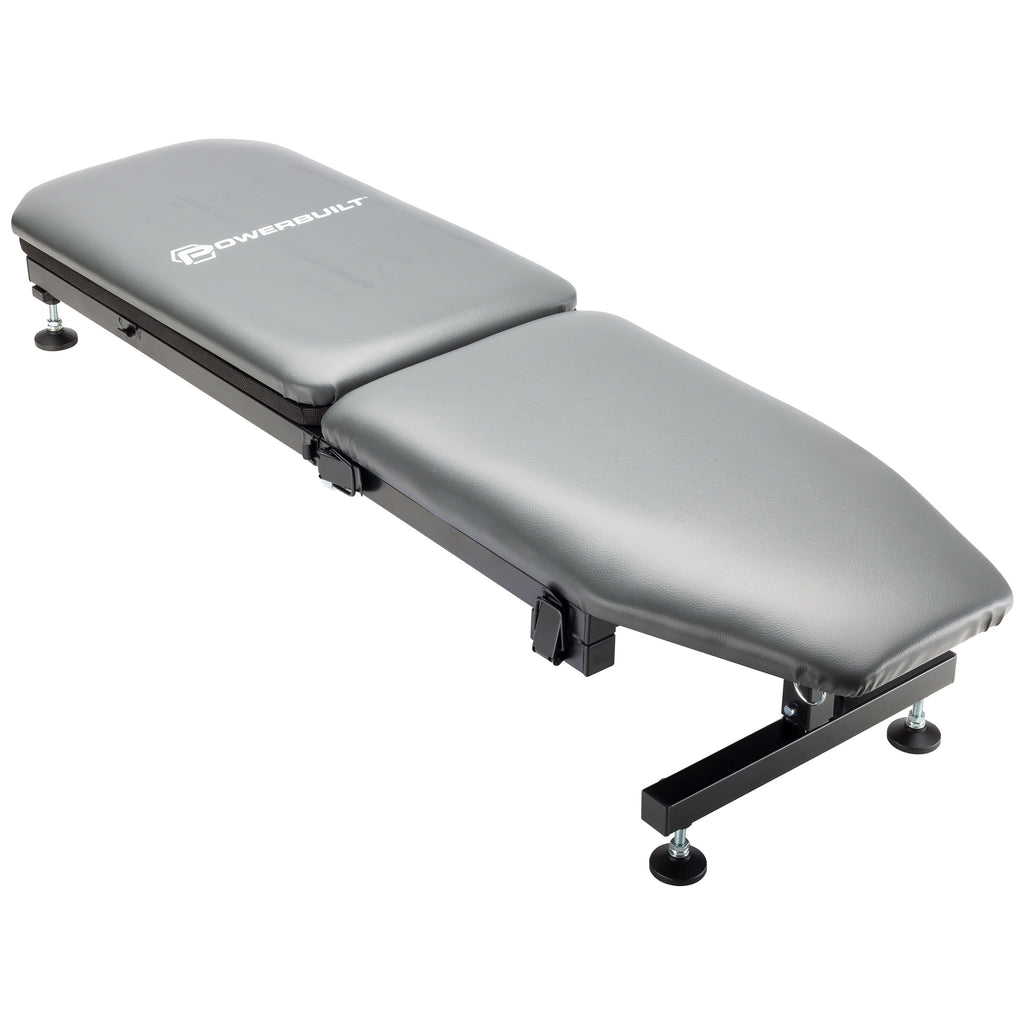The ultimate back-saving tool for tight spaces. Say goodbye to discomfort with the Powerbuilt Foldable 2 in 1 Under Sink / Cabinet Back Saver; an innovative solution for under-sink plumbing, cabinet work, and more. Featuring a versatile headrest that doubles as a knee pad, it ensures comfort for any household, office, or garage project. Adjustable rear legs provide a stable, level workspace, while cushioned feet protect floors and adapt to various positions. Ideal for plumbers, handymen, and janitorial tasks, it offers unmatched versatility. Fold the front legs and adjust the back legs for in-cabinet projects. When the job is done, it folds in half and locks for easy storage and transport.
