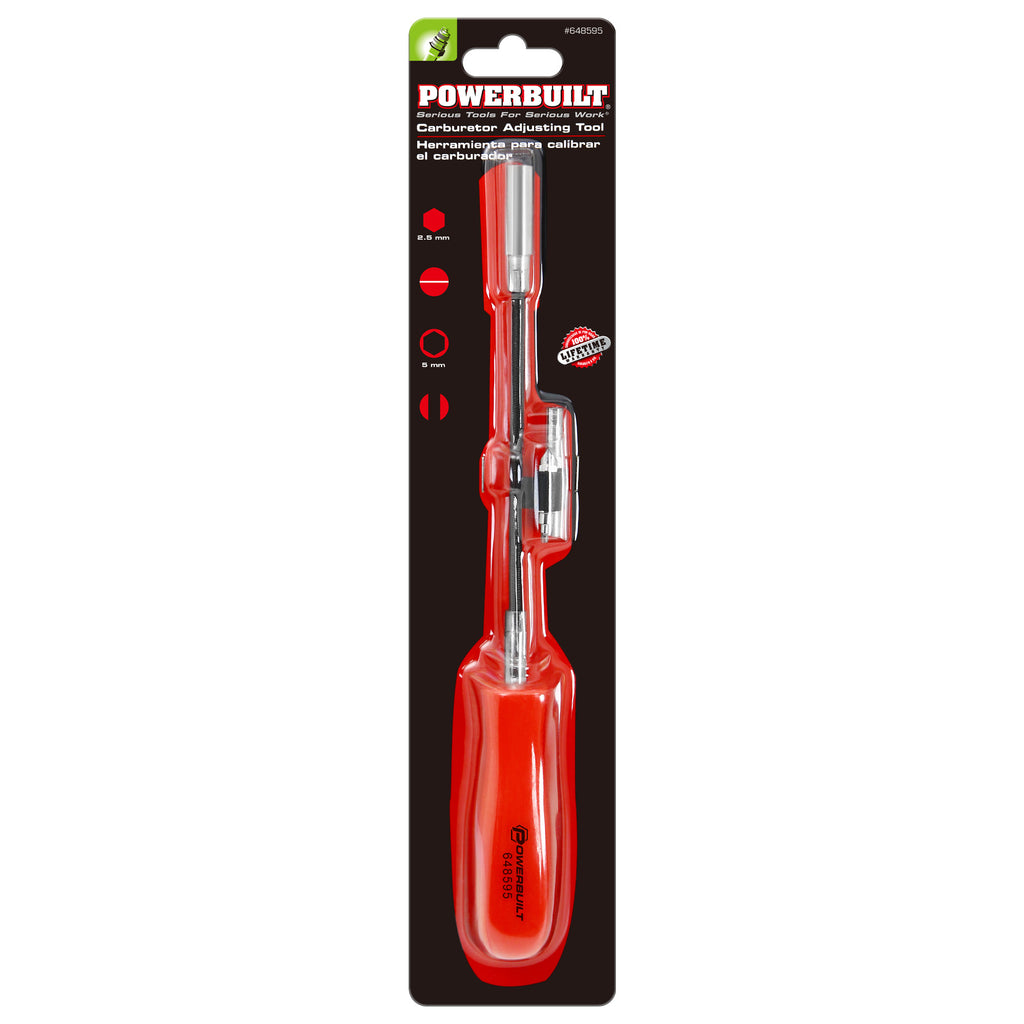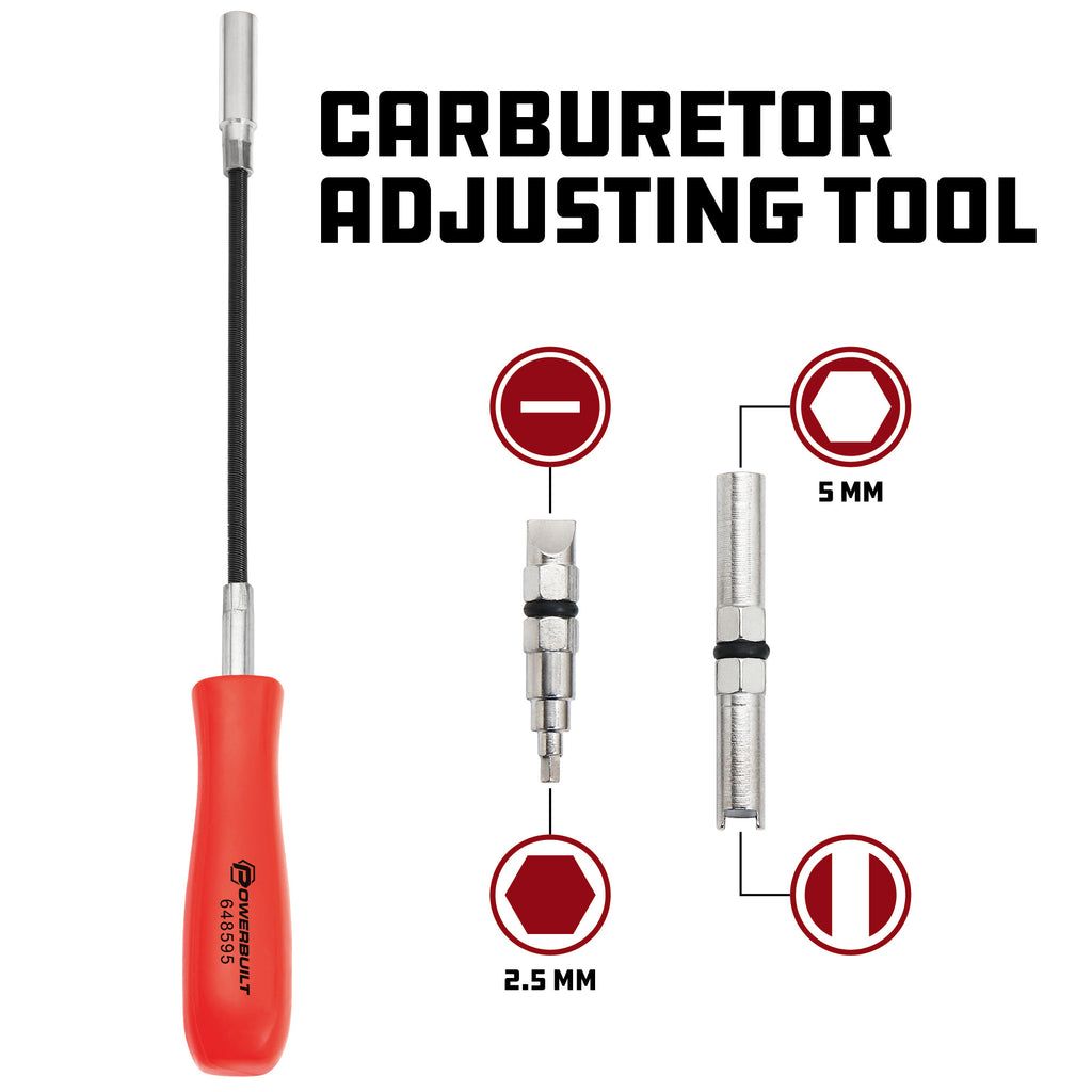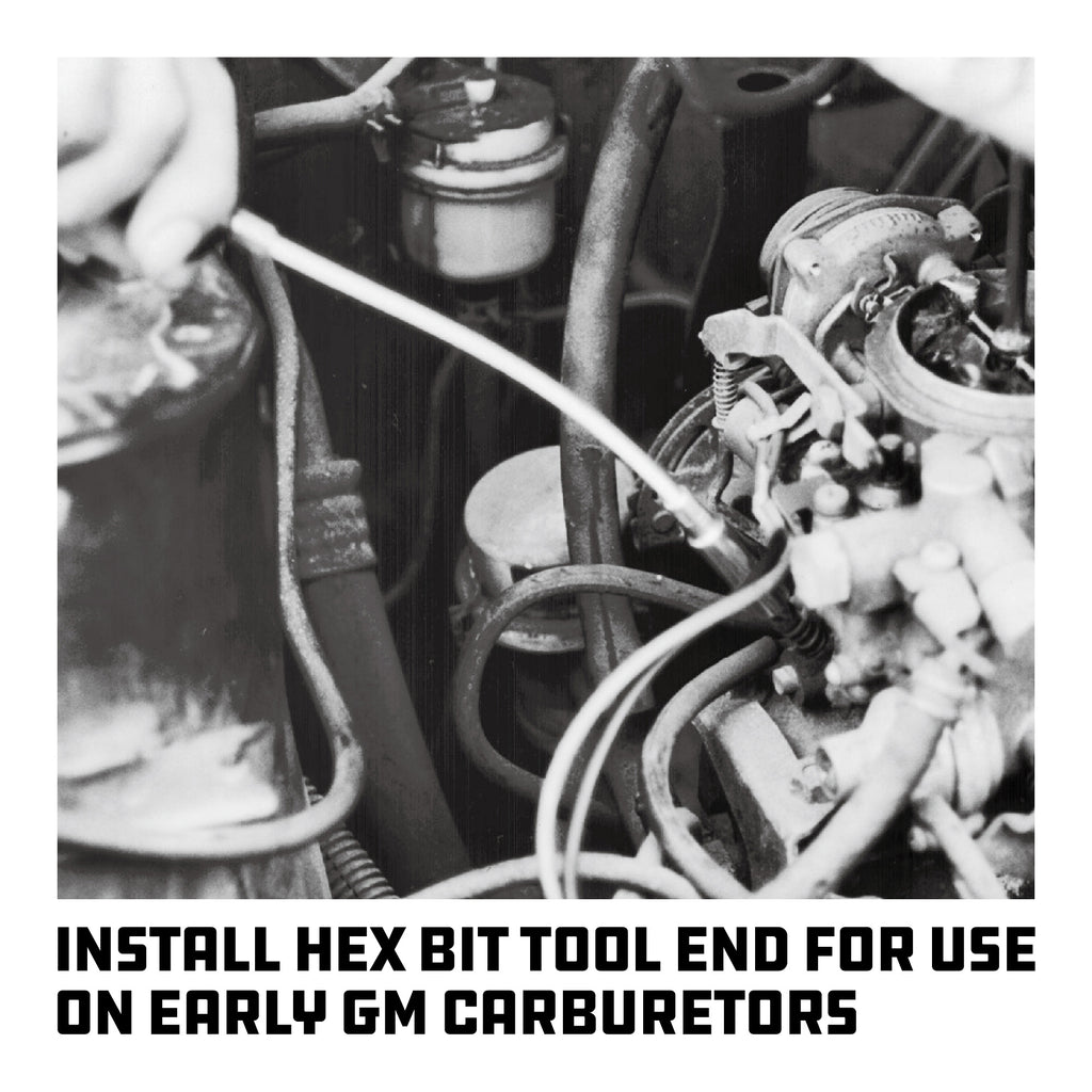 For adjusting carburetors where idle and mixture adjusting screws are difficult to reach with a regular screwdriver. Flexible shaft. Includes a screwdriver end, 5mm socket end, hex bit tool end for use on 1979 and later GM carburetors. Meets or exceeds ANSI standards. Lifetime warranty.