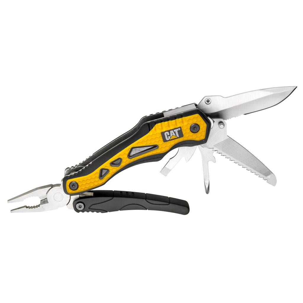 Here's the perfect gift for anyone who loves big yellow machines! This Gift Box, 3-Piece Multi-tool, Knife Set is just the ticket for Cat enthusiasts and anyone who enjoys using quality tools. The set includes a 10-in-1 multi-tool featuring a liner locking stainless-steel serrated edge knife, saw blade, slotted and Phillips screwdrivers, versatile long nose pliers with built-in crimpers and wire cutters, a file, a bottle opener, and a glass breaker. The gift set also includes a trusty drop point Stainless Steel 7-3/4 inch folding knife with PP /TRP comfort grips and a useful emergency glass breaker. The knife features both a carabiner clip and a pocket clip for two carry options. Then rounding out this great gift set is a 13-function carabiner keychain multi-tool with independent slotted and Phillips screwdrivers, string cutter, pry bar, nail puller, bottle opener, and multiple wrenches in various sizes, 1/8 inch (3 mm), 3/16 inch (5 mm), 1/4’ inch (6 mm), 5/16 inch (8 mm), 11/32 inch (9 mm), 3/8 inch (10 mm). All three quality tools come in a nice high-end Cat color gift box.