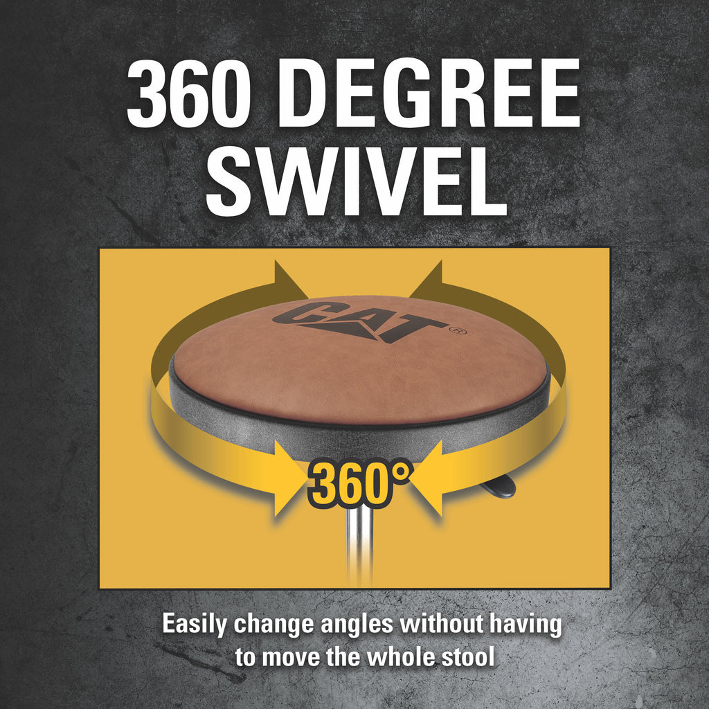 This rustic-style CAT Pneumatic Shop Stool with a custom base is perfect for any garage, shop, bar, or hangout. It features a comfortable 14-inch wide leather, cushioned seat with a height adjustment range of 4.75 inches, the freedom of 360-degree swivel, and a sturdy footrest. This high-quality stool can hold up to 350 lbs.